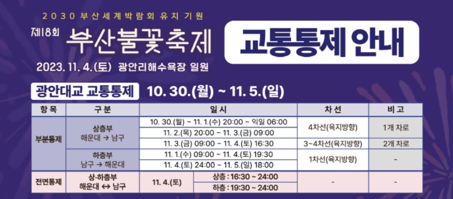 광안대교, 해변로, 이기대공원로 등 행사장 주변에서 1, 2, 3단계 단계별로 교통 통제를 실시하오니 아래 교통통제 안내 정보를 꼭 확인하시기 바랍니다.