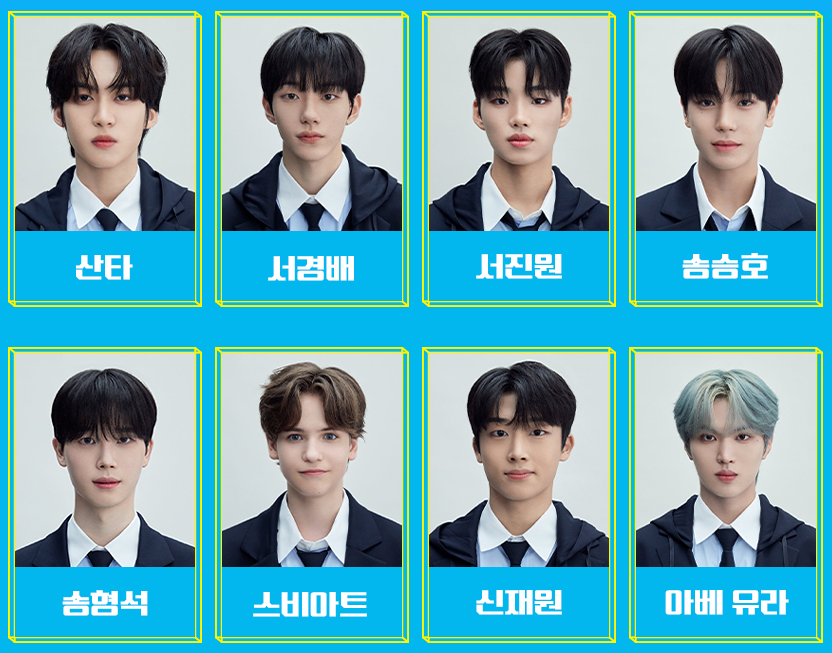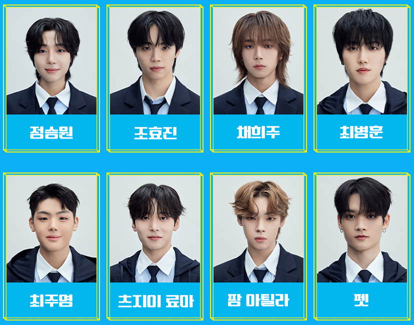 100인의 연습생 : 강민서, 강왕석, 강지민, 강현우, 강희민, 고민성, 권양우, 권예웅, 권용현, 김단우, 김도훈, 김민준, 김성민, 김성준, 김시율, 김시훈, 김영훈, 김윤수, 김은호, 김정민, 김정윤, 김주현, 김준우, 김지민, 김지환, 김태성, 김태유, 김현우, 김현재, 남지운, 린린, 린웨이천, 마나베 진, 마징시앙, 박준서, 박준우, 박찬용, 백지호, 빙화, 사쿠라다 켄신, 산타, 서경배, 서진원, 송승호, 송형석, 스비아트, 신재원, 아베 유라, 아사카 코타로, 아야론 아담, 안준원, 앤디, 야마구치 사토시, 양주호, 어엄, 염예찬, 오바야시 유우세이, 오승찬, 오영웅, 오태환, 옥창현, 우첸유, 우하준, 유영서, 유지안, 유현승, 유희도, 윤주한, 이건우, 으노율, 이도경, 이유준, 이은서, 이주찬, 이준선, 이지훈, 이첸, 이한빈, 이효빈, 임시우, 임현우, 장경용, 장여준, 장인재, 장현석, 전민욱, 정든해솔, 정세윤, 정승원, 조효진 ,채희주, 최병훈, 최주영, 츠지이 료마, 팡 아틸라, 펫, 하석희, 허우관이, 후쿠야마소타, 정요한 외